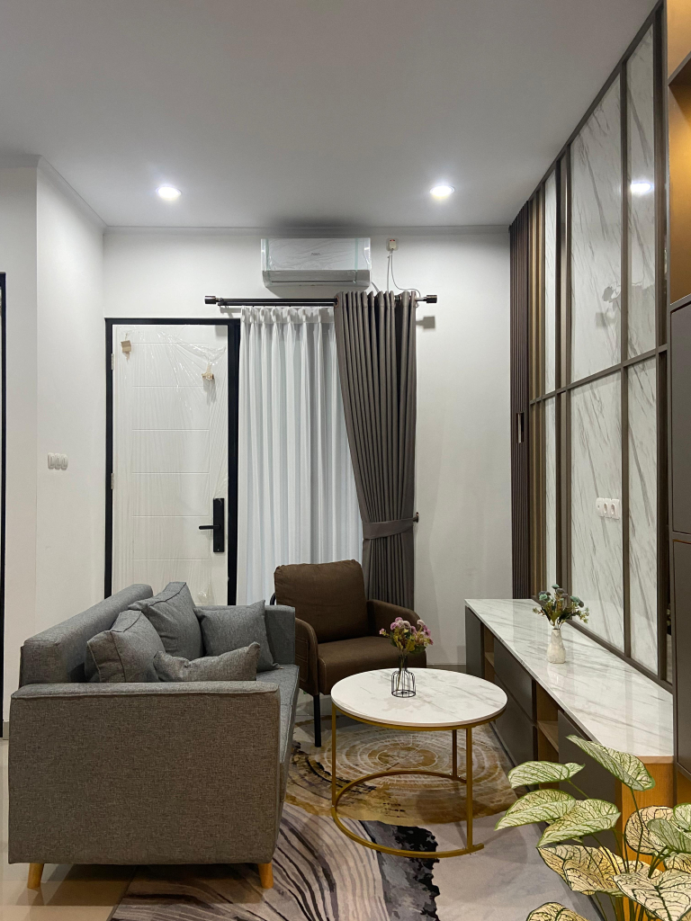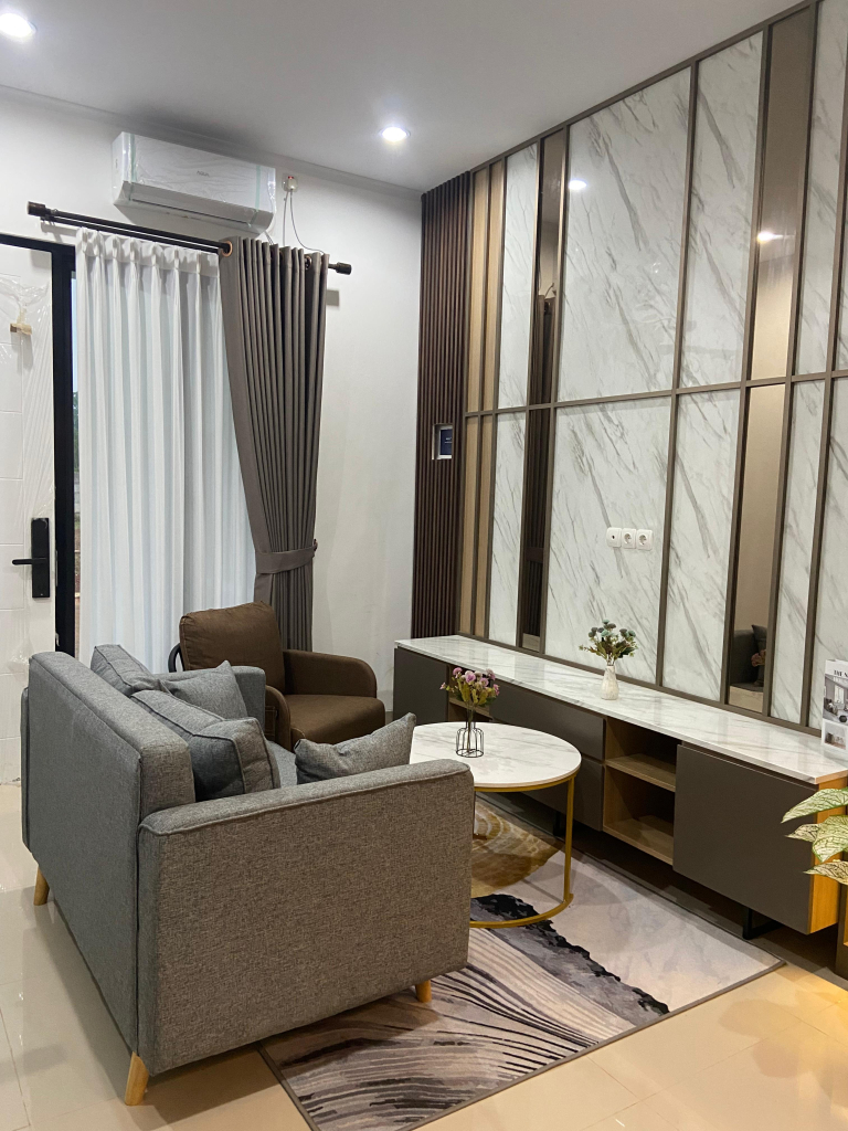 Salah satu ruangan terpenting dalam sebuah rumah adalah kamar tamu. Pada proyek ini, kamar tamu minimalis dirancang dengan furnitur yang tidak hanya menarik secara visual, tetapi juga sangat fungsional. Penggunaan sofa berwarna netral ditambah dengan bantal berwarna cerah menciptakan suasana yang hangat dan ramah. Detail seperti meja kopi dengan desain simpel namun elegan memberikan sentuhan timeless yang membuat para tamu merasa nyaman.